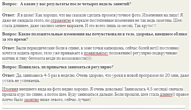 "Я испытываю восторг, радость от занятий , от реальной возможности себя изменить , хотя мне тяжело даются некоторые упражнения . Я вдруг поняла , что значительно улучшить своё тело можно не только в юности, но и в зрелые годы , когда кажется , что твой скрючивающийся позвоночник , дряхлеющее тело - это необратимое печальное проявление времени.